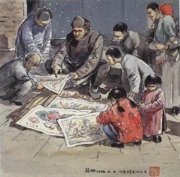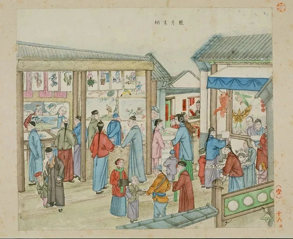 1938年出版的《京津风土丛书》中,收有蔡省吾撰《燕市货声》。作者有感于“咸同年后,去故生新,风景不待,十年而已,变至今则已数变矣”,遂将所见所闻著成此书。据张次溪跋语,蔡“为人方正,崇李二曲之学,思想甚新,往往开风气之先河……《燕市货声》实启治风土学之先声”。书中有关于售卖杨柳青年画的记述。在“腊月”一章中写道:“卖杨柳青大小张画,俗呼‘卫抹子’,一苇箔夹之肩负。”还配以“画咧,卖画”的叫卖声。除了走街串巷的行商,还记录了神纸摊上“揭门神,请灶王,挂钱儿闹几张”的吆喝声。规模更大者当属画棚,其招揽顾客的唱词也更有板有眼:“买的买来稍的稍(捎),都是好纸好颜料,东一张,西一张,贴在屋里亮堂堂!臭虫它一见,心欢喜,今年盖下了过年的房”。
