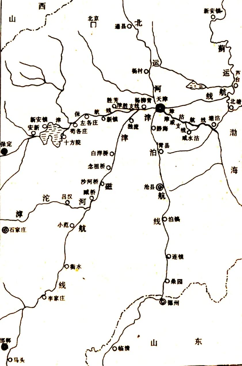 1915年3月25日,“津保航线(天津至保定,大清河航线)”进行延长,由苏桥延伸至安新县新安镇,途经站点为:天津、杨柳青、高庄子、台头、石沟、左各庄、苏桥、苑口、药王庙、史各庄、十方院、王家寨、再到安新县新安镇。每年客运量有5—7万人次。同时辟有“津胜支线”,由天津经杨柳青、高庄子至胜芳,航程40公里。